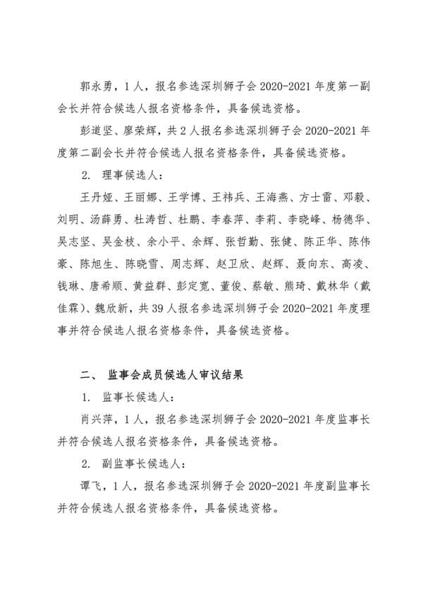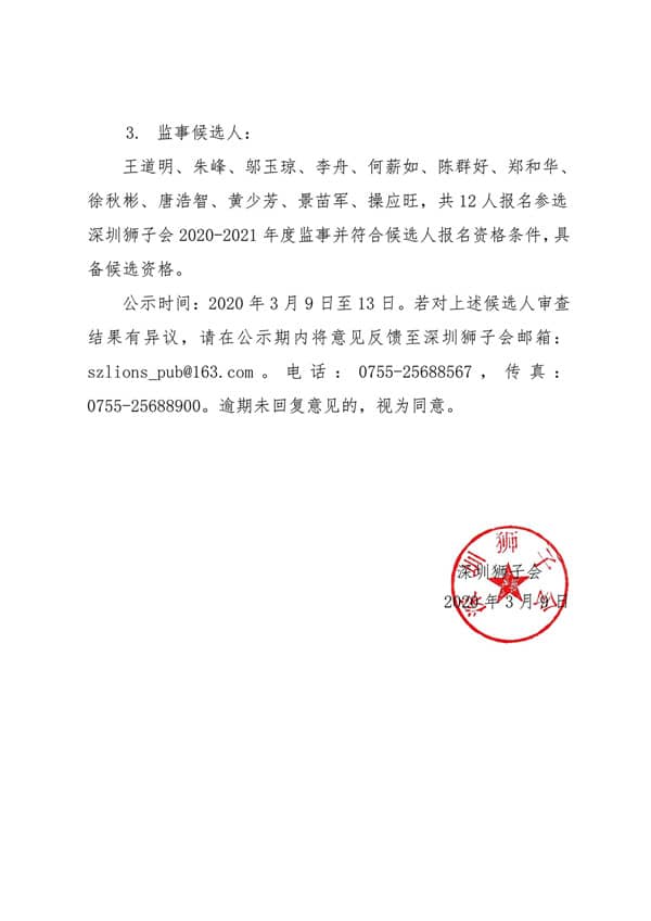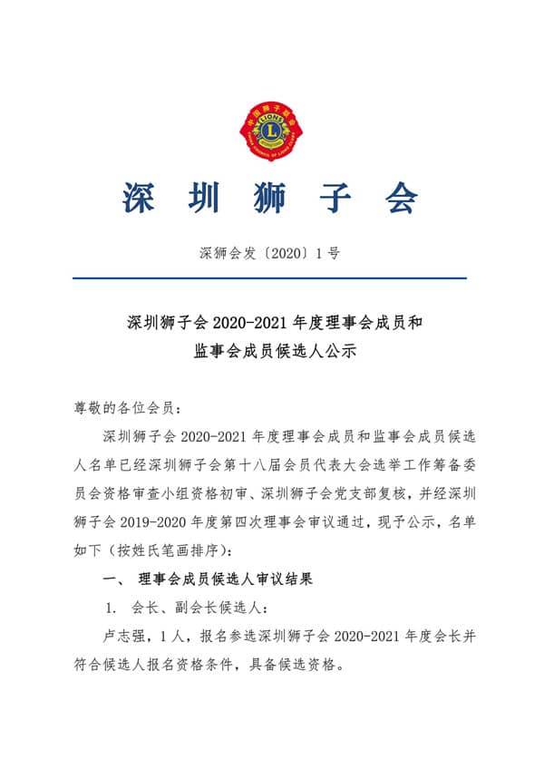 公示 | 深圳狮子会2020-2021年度理事会成员和监事会成员候选人公示