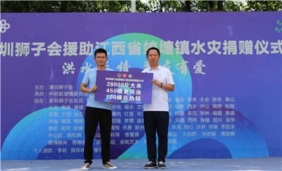 8月26日,深圳狮子会援助吉安市峡江县水灾捐赠仪式在峡江县水边镇人民政府举行,向当地受灾群众捐赠150床空调被、300袋大米、600桶食用油、100盒自然米饭,合计5.3万元。峡江县水边镇常务副镇长谢艳辉、共青团峡江县委书记熊晶晶,深圳狮子会子蒙服务队队长包人杰、前程服务队队长曹美秀、善德服务队队长陈永萍、金铭服务队队长揭冰、华林服务队队长李雪菲、笔架山服务队队长熊焰,锦绣服务队队长谢天赐、秘书黎澄宇及受灾群众出席活动。