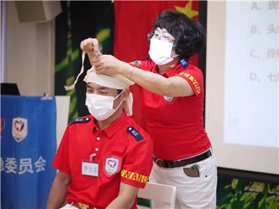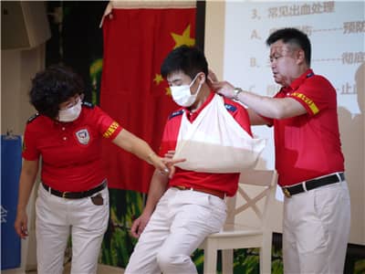 本次课程内容丰富、实用,在主讲教练雷高清的生动及专业的讲演中,学员们边学习理论边进行实操。首先是急救基础理论和创伤救护技术,助教吴志坚、李万龙详细地示范戴上和摘除手套的正确方法、手臂止血包扎技术、手臂骨折包扎技术,崔伟英主席讲解头部包扎技术;雷高清教练讲演了各类型的家庭常用急救方法:烫伤、蜂蜇、宠物咬伤、毒蛇咬伤、电击等。