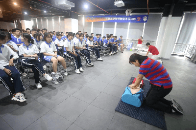 本次宣讲活动分为上、下午两场,每场有400名学生参加,课程包括了急救基础理论、创伤救护技术、家庭救护、气道异物梗塞急救“海姆立克急救法”以及心肺复苏技能。