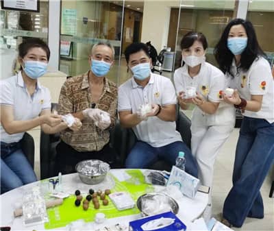 深圳狮子会医疗卫生委员会(狮爱驿站)执行主席黄婷尹、陈珩,长远服务队队长曾小玲、前队长郑建海、狮友胡红梅、王小利、蔡秀软;中心区服务队前队长张旭雯,狮友王欣等参加活动。狮友一行到狮爱驿站现场与肿瘤中心住院患者及医护人员一起手工制作冰皮月饼。每一个月饼的完成都代表了大家的通力合作和感情支持,现场一片其乐融融。