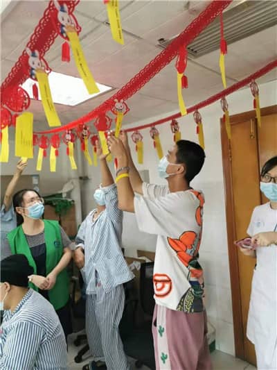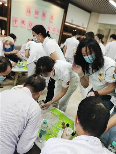 在血液科,患者分成三组参与到紧张而有趣的游戏比赛中。“猜灯谜”让大家体验中秋习俗又了解了健康知识;“投壶”让大家体会到古代游戏的乐趣;“你比我猜”患者卯足劲的比划,引得现场哄堂大笑;“猴子捞月”夹弹珠紧张刺激,也锻炼了手部灵活性。游园游戏结束后,病友一起做手工灯笼,畅谈家乡习俗。虽然无法与家乡亲人共聚一堂,但在千里之外共度中秋,病友纷纷表示,狮子会的中秋关爱让人倍感振奋,一定要克服困难,战胜病魔。