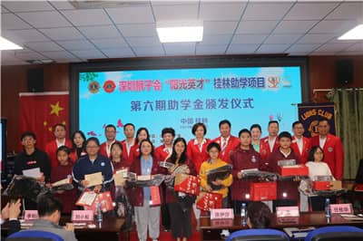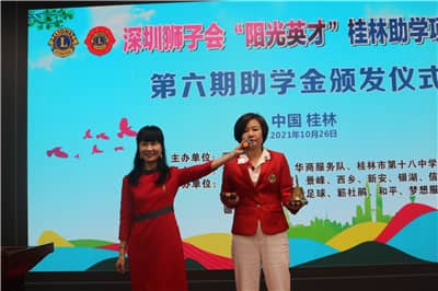 2021年10月26日,深圳狮子会“阳光英才”桂林助学项目第六期捐赠仪式在广西壮族自治区桂林市第十八中学报告厅顺利举行。活动向桂林市第十八中学30名学生每人捐赠5000元助学金及保温杯、书包等物资,并组织学生参加心理辅导课,服务经费30万元。