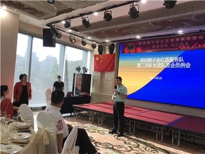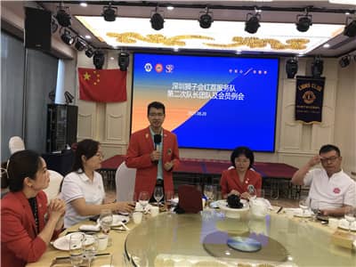 2021年8月20日,深圳狮子会红荔服务队2021-2022年度第二次队长团队会议暨例会在南山区华侨城大厦南洋长胜酒家召开。中国狮子联会教育培训委员会培训教学部副主任荣静,深圳狮子会助学服务委员会及医疗卫生委员会执行主席陈珩、财务建设委员会执行主席龙雅丽,红荔服务队队长梁奕东、上届队长吴桂城、第二副队长杨莉、第三副队长王立君,前队长刘小宁、王艳华、何永安、张健、高全斌、唐文萍、黄益群、姚小忠、王守军,秘书梁文娟、财务李嵘、总务肖剑、纠察陈丽新等27人出席会议,会议由张健担任大会主席并主持。