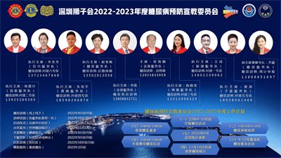 2022年10月20日,深圳狮子会2022-2023年度“红色初心 蓝色使命”——糖尿病预防宣教服务活动启动仪式在罗湖区望桐路碧源山庄顺利举行。深圳狮子会会长彭道坚、监事长翁华,创会会长、创区总监谢建文,前会长苏泽然、总务长陈旭生、纠察长连楚海、常务副秘书长于小萍、副秘书长李春畅,专区主席黄少芳、林晓义、吴志坚,分区主席刘军、朱红伟、张文清,监事李舟、邓毅、赵辉、王丹娅、李晓峰、吕桂琴,糖尿病预防宣教委员会主席张海腾、助残委员会主席苏健华、导狮团团长欧阳帆,糖尿病预防宣教委员会执行主席李锋、赵雪梅、陈晓雪、王成、张盛兴等200余人出席活动。本次启动仪式由张盛兴担任大会主席,由赵忠、齐颖主持。