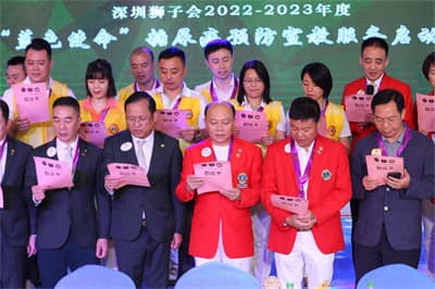 深圳狮子会会长彭道坚带领在场的领导狮友和糖尿病预防宣教委员会的团队成员,一同上台亮灯,深圳狮子会2022-2023年度糖尿病预防宣教服务正式启动。深圳狮子会本年度服务队队长代表上台宣读《深狮糖宣“蓝色使命”倡议书》。