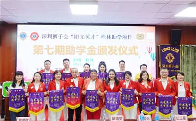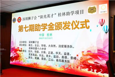 2022年11月11日,深圳狮子会“阳光英才”桂林助学项目第七期捐赠仪式在桂林市第十八中学科技楼多功能厅顺利举行。活动向桂林市第十八中学30名低收入家庭学生捐赠15万元助学金,并捐助一批价值5万元的深圳手信,投入服务经费20万元。