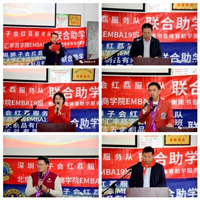 本次助学公益服务活动由尹姗、王立君担任大会执行主席,梁奕东担任总统筹,红荔服务队狮友、北京大学汇丰商学院EMBA19班同学们、爱心人士及家属们一行共25人参加。活动分别给邵阳县第十一初级中学捐赠“书宝奖”奖学金13万和“护瞳行动”60间标准LED光源护眼灯教室20万元,向衡南县向阳中心小学捐赠“春蕾五体球场”21.5万元和“春芽阅览室”3848册图书4万多元,总服务经费58万余元。