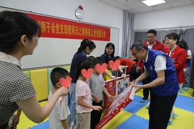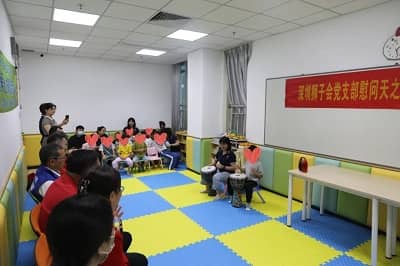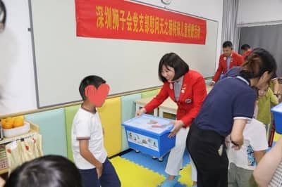 2023年6月14日,在党的生日到来之际,深圳狮子会党支部前往布吉街道文景社区天之骄康复服务中心,开展关爱特殊儿童活动,向天之骄康复服务中心捐赠50箱积木玩具和饮品、零食等物资,何永安狮兄个人捐赠14套“愉乐未来组合屋”玩具,共投入经费约3万元。
