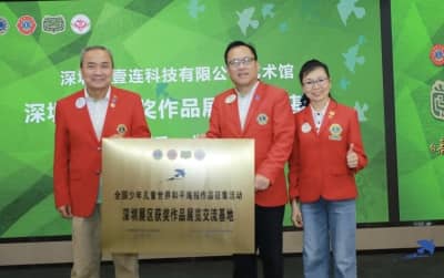田王星狮兄无偿提供“深圳壹连科技股份有限公司艺术馆”作为长期展出和平海报获奖作品的展览交流基地,让深圳展区获奖作品的艺术观赏价值得到最大化的展现。彭道坚会长与魏巧珠主席把“全国少年儿童世界和平海报作品征集活动深圳展区获奖作品展览交流基地”牌匾授予田王星狮兄,感谢其对和平海报服务项目的认可和支持。