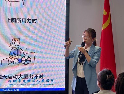 宣讲环节中,邵荣妹担任宣讲师,介绍了脑卒中的危害与现状。赫丹丹医生从专业角度讲解了脑卒中的危害、前兆症状以及发病后的应对措施,强调预防是降低发病风险的第一道防线,发病后的黄金救治时间对治疗效果至关重要。现场还设置了问答环节,赫丹丹医生逐一解答了大家的疑问。