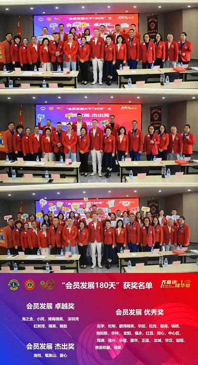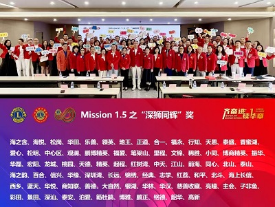 表彰环节亮点纷呈,八大奖项依次揭晓。马敏、赵辉、黄洁玲共同为温瑶丽、陈陆、郑和华、陈柱湛、谢健明、霍曼颁发“会员发展巨大贡献奖”,并赠送中国狮子联会Mission1.5徽章,以表彰其在会员发展工作中作出的突出贡献;79支服务队第一副队长荣获“精诚助力奖”,充分彰显其在服务队组织建设中的关键作用。本年度新创立的志学、上善、启惠、球爱、福海、向阳等六支服务队荣获“华狮·创队先锋奖”;21支服务队荣获“华狮·聚力成长奖”,展现了各服务队在会员发展进程中的稳健提升与持续突破;34支服务队在“会员发展180天”评选中分获“卓越奖”“杰出奖”“优秀奖”,涵盖不同发展规模的服务队,全面肯定了各服务队辛勤耕耘与显著成效;另有79支服务队荣获Mission1.5之“深狮同辉奖”,充分彰显深圳狮子会强大的组织凝聚力与广泛号召力。